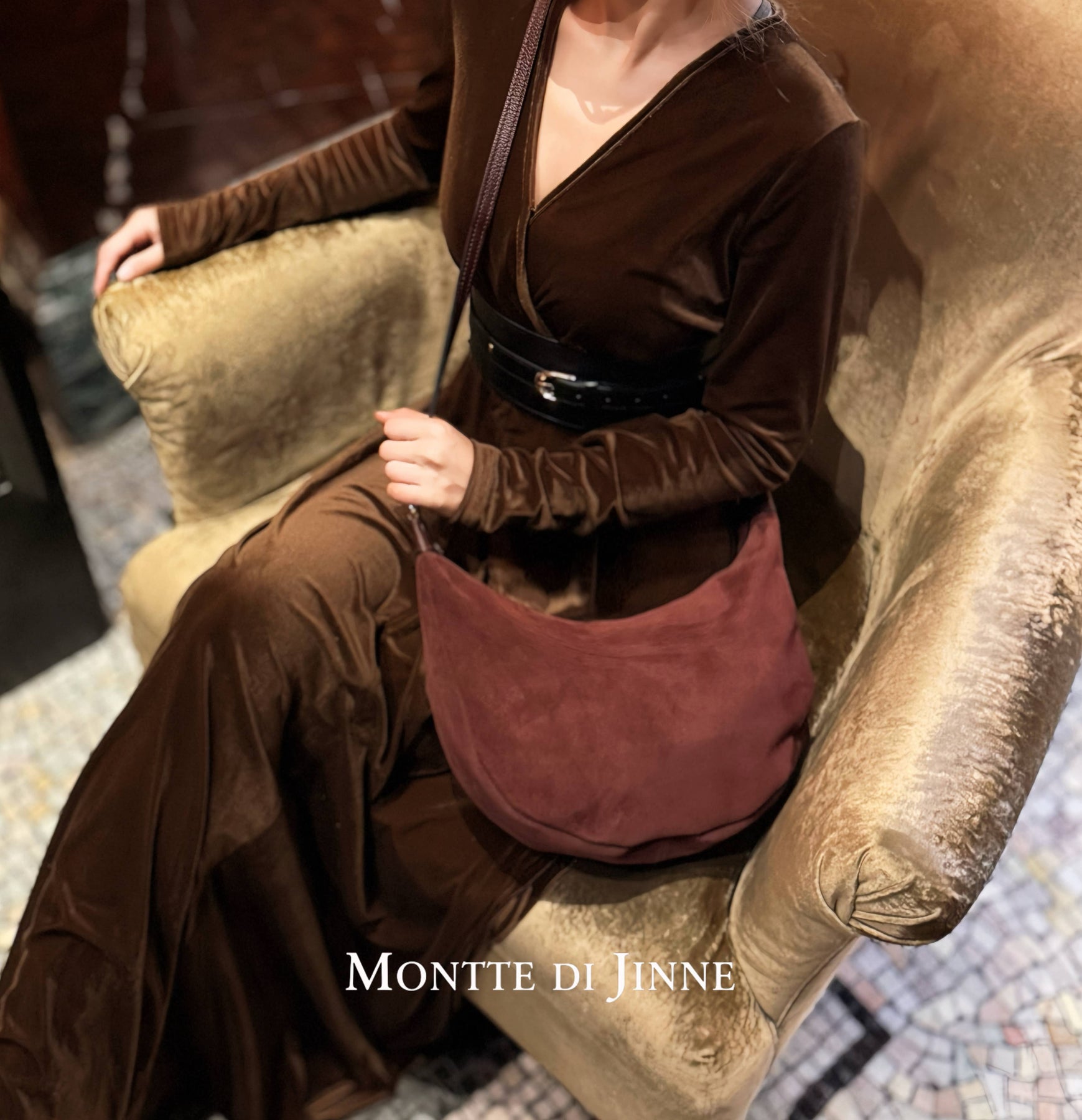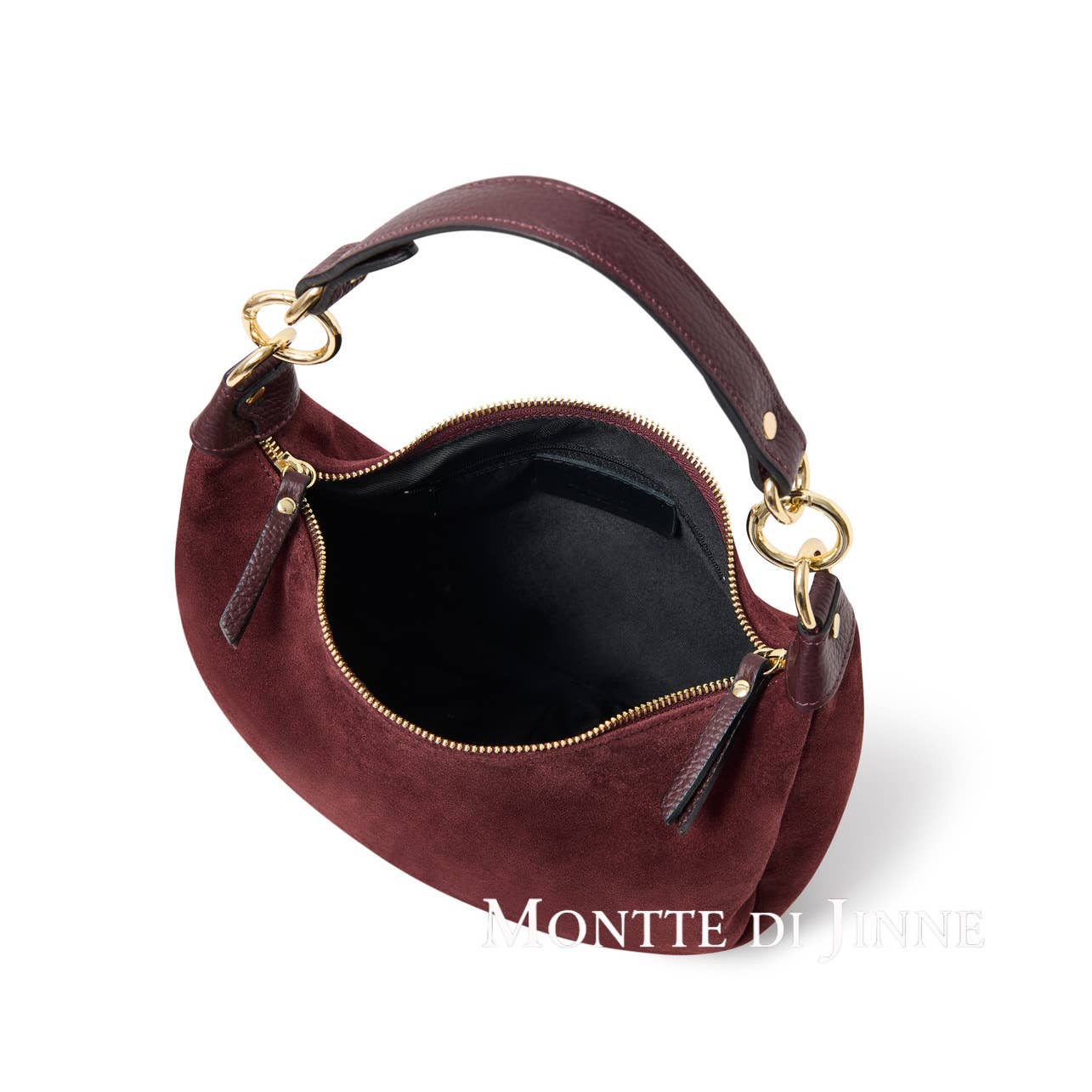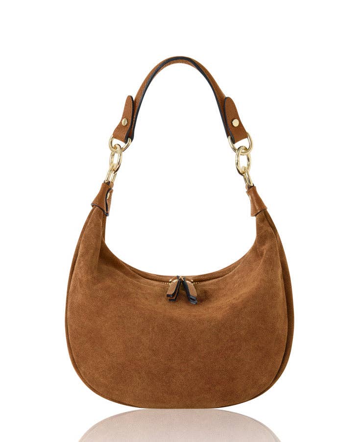Outer Material: Italian Premium Suede with Genuine Leather Trim Inner Material: Fabric Lining Interior: Main compartment with an internal zip pocket for organising essentials Closure Type: Top Zipper Closure Hardware: Light Gold-Tone Hardware Strap: Genuine leather short strap, suitable for hand carry or shoulder wear. Adjustable & detachable long leather strap for shoulder or crossbody wear Handmade in Italy Dimensions: Length: 30 cm | 11.8" Height: 20 cm | 7.9" Depth: 10 cm | 3.9" Description: This curved shoulder bag is carefully handcrafted by skilled Italian artisans, using premium Italian suede paired with a genuine leather handle to create a piece that balances refined luxury with everyday wearability. Its soft, rounded silhouette feels both modern and timeless, making it easy to style with casual looks or more polished outfits. Lightweight and practical, this bag is designed for daily use and can be worn comfortably as a shoulder bag or crossbody. The contrast between supple suede and smooth le