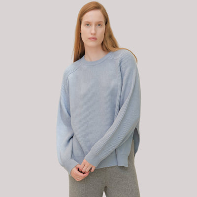 Chelsea Cashmere Mix Crewneck Ribbed Sweater with Side Slits | Dusty Blue