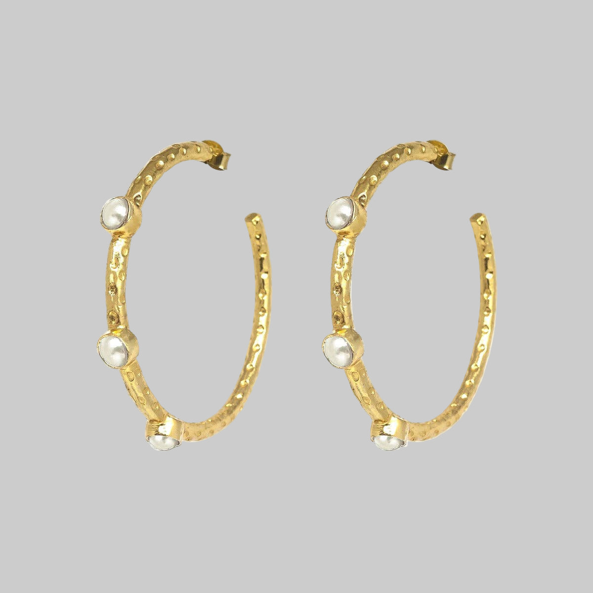 The Jenny is a textured large gold hoop earring, set with genuine semi precious freshwater pearls. 22 carat gold plated brass Freshwater pearls Size: 4.5 cm Hypoallergenic sterling silver earring posts. Handmade. Comes in presentation pouch.