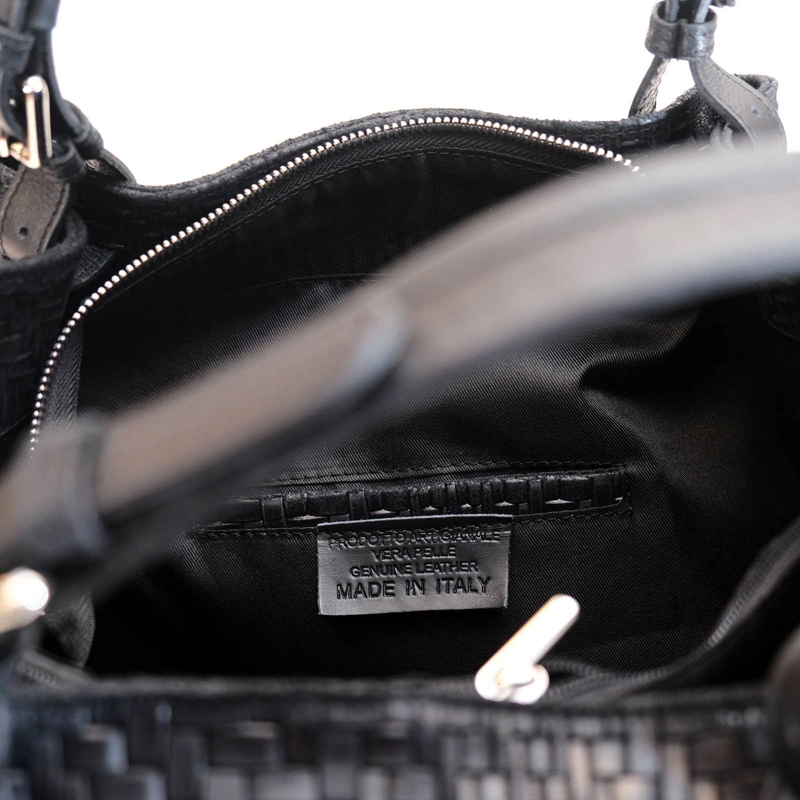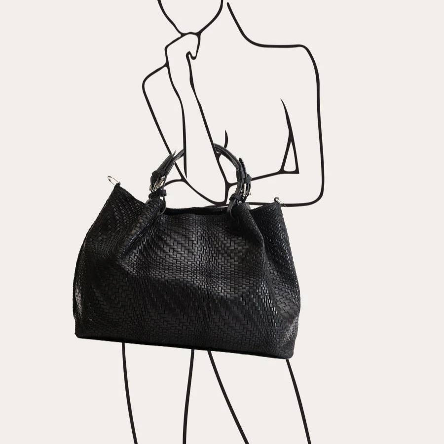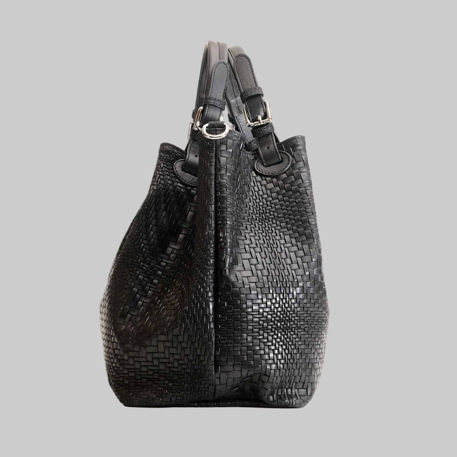 Marta is a large woven print leather tote bag, featuring dual top handles and detachable/adjustable shoulder strap. Spacious lined interior, divided into three compartments . Silver Finish Buckles. Cotton Dust Bag. Hand made to order in Italy