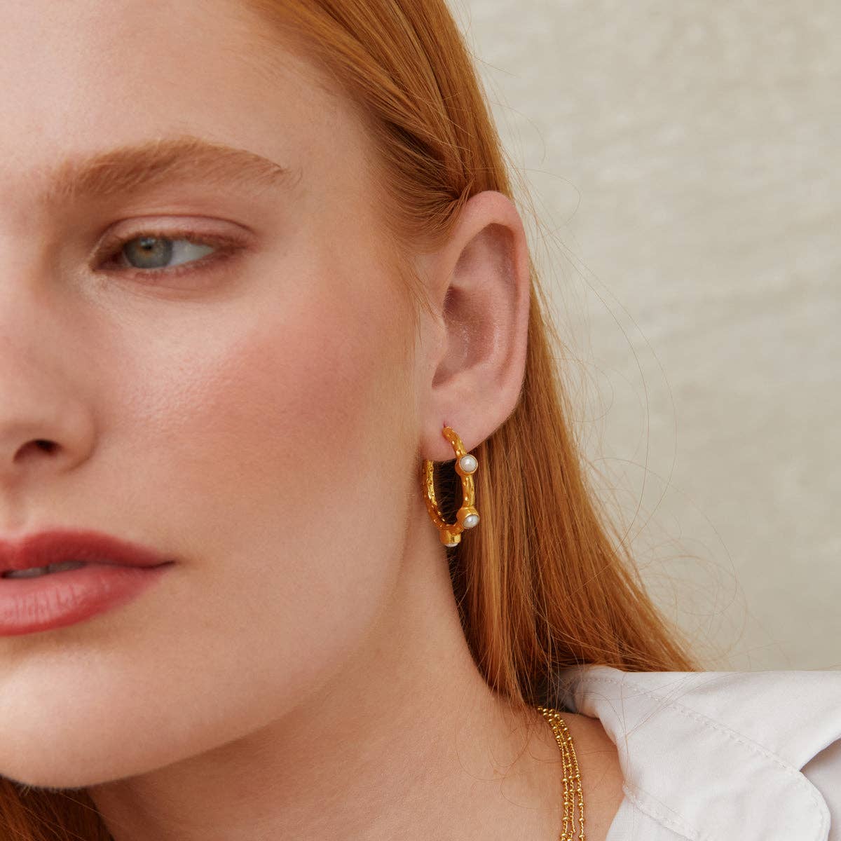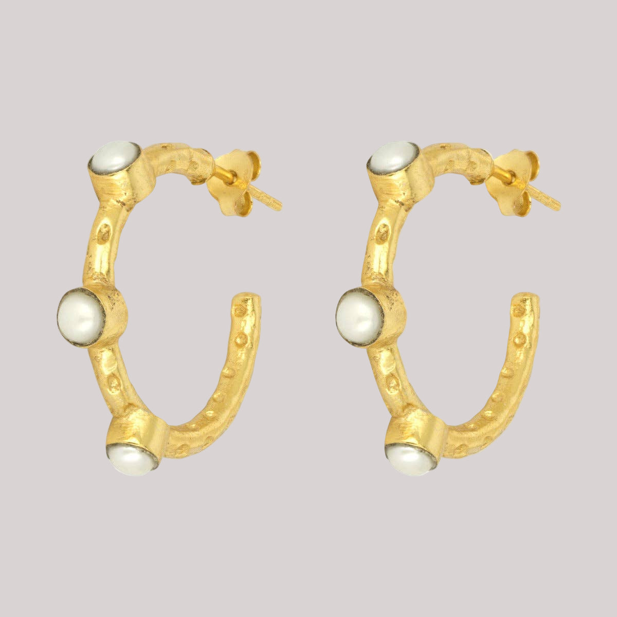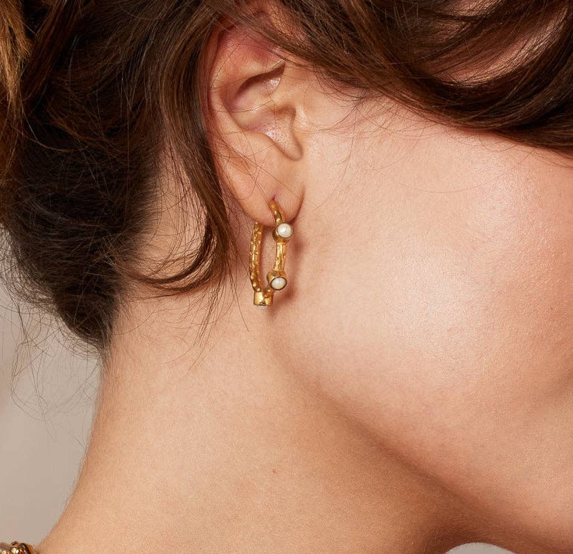 The Celeste Freshwater Pearl Gold Hoop Earrings are hand crafted by artisan jewellery makers from 22 carat textured gold plated brass, inlaid with freshwater pearls. Size: 2.5 cm Hypoallergenic sterling silver earring posts. Presented in Style Confidential Gift Pouch. Perfect for practically any occasion.