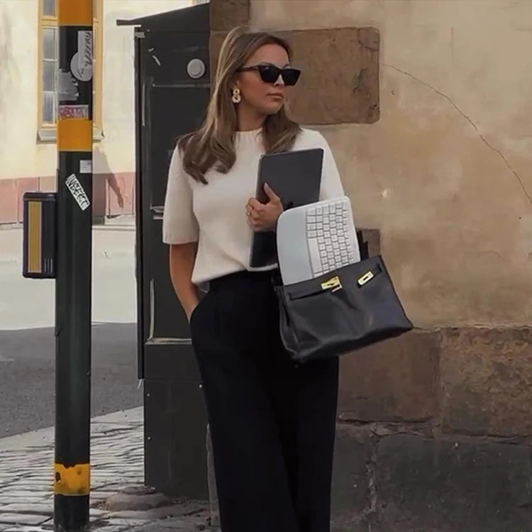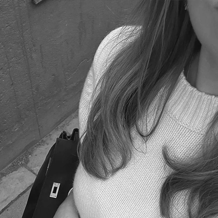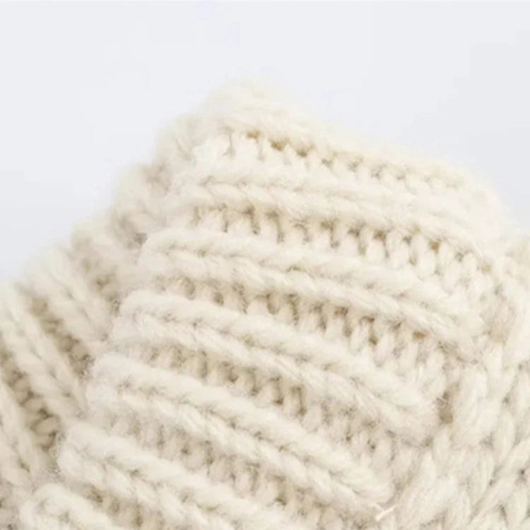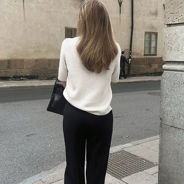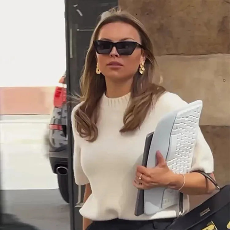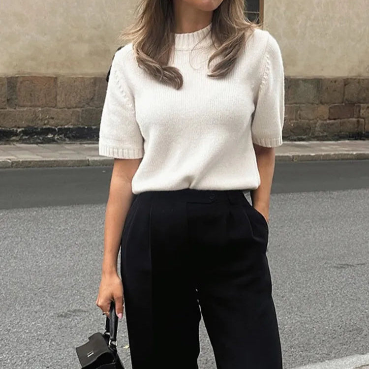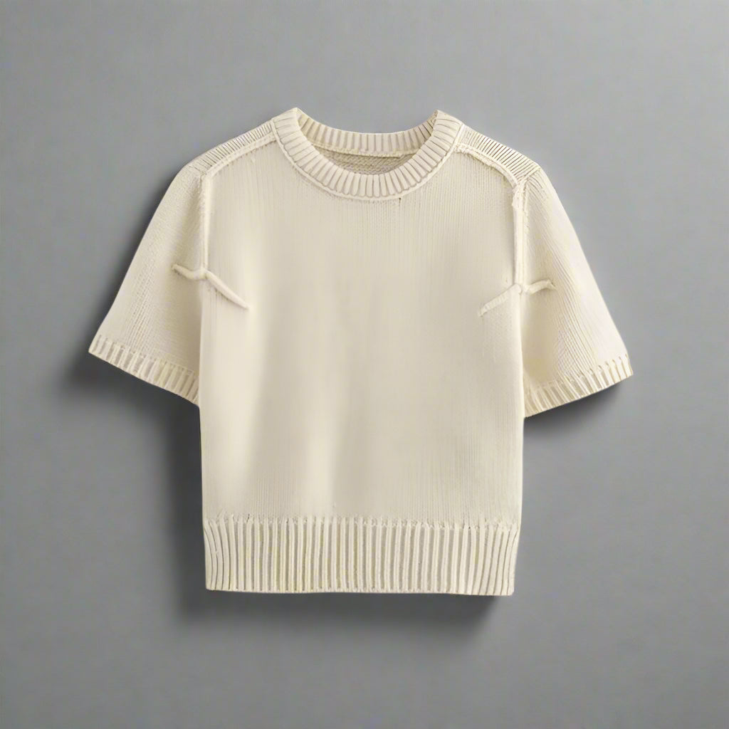 The Becki is a short sleeve, crew neck sweater in cream. Large gauge knit. Sizes small, medium or large. Polyester.