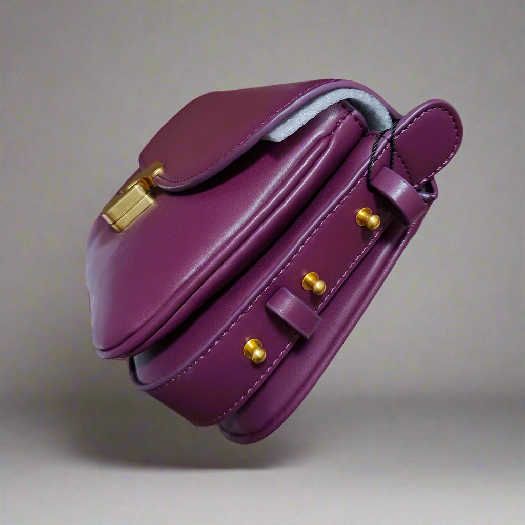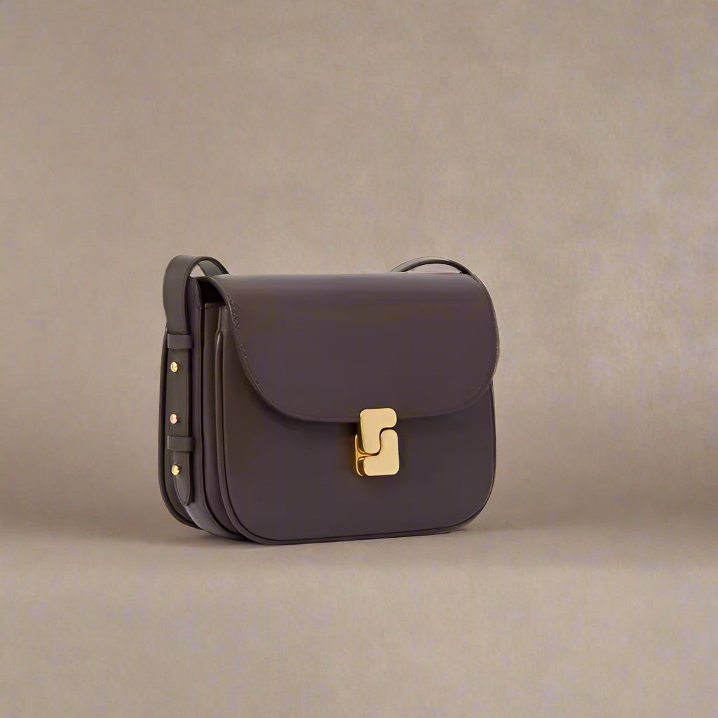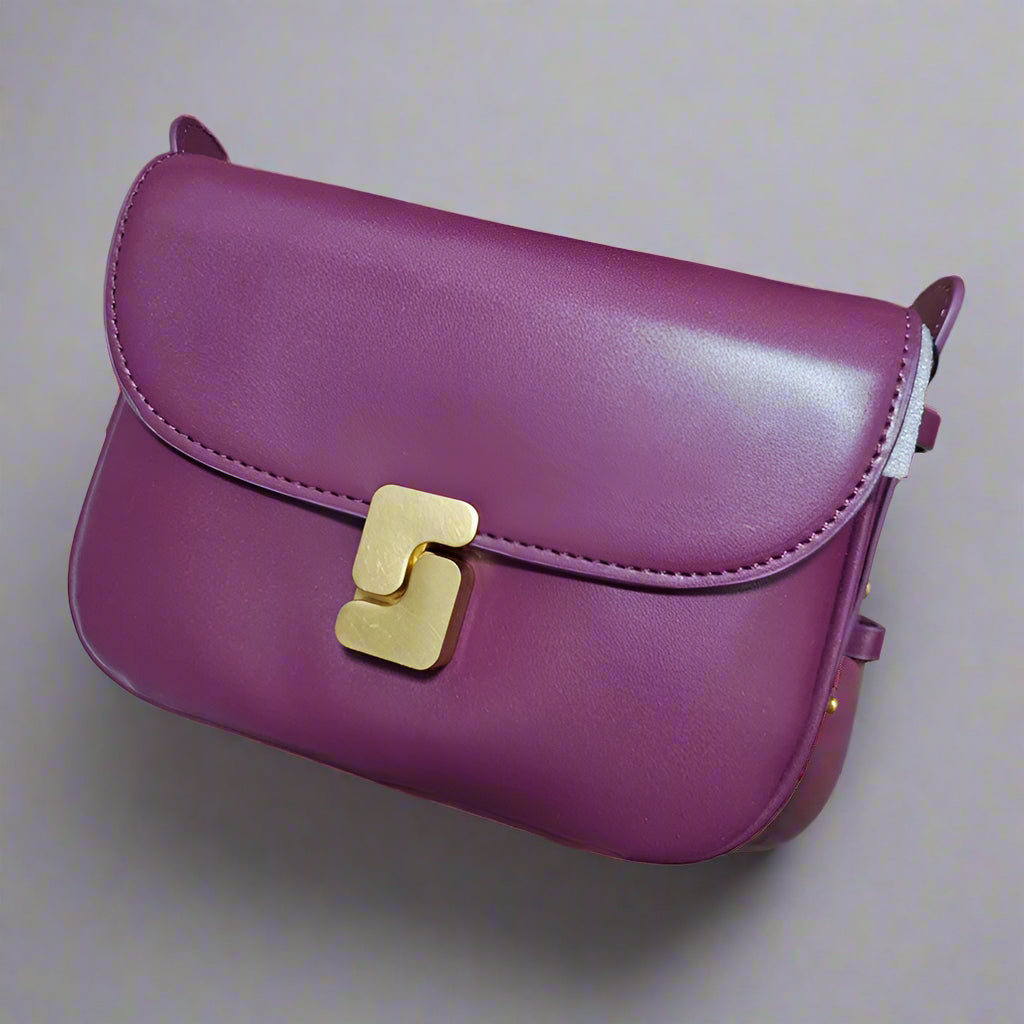 The Regents Park vintage style shoulder bag is an envelope style box style featuring gently rounded edges to the flap. Puzzle style hasp closure in brushed gold. Three interior compartments. Black, Dark Brown, Purple, Sage Green and Tan.