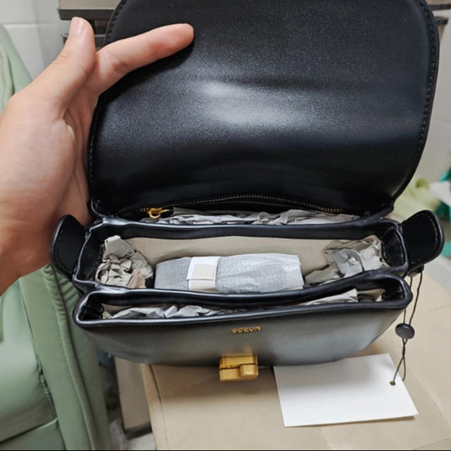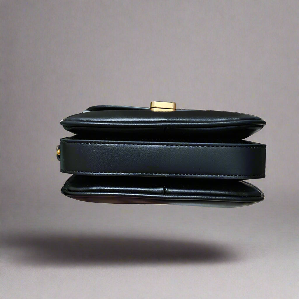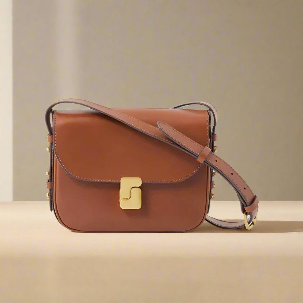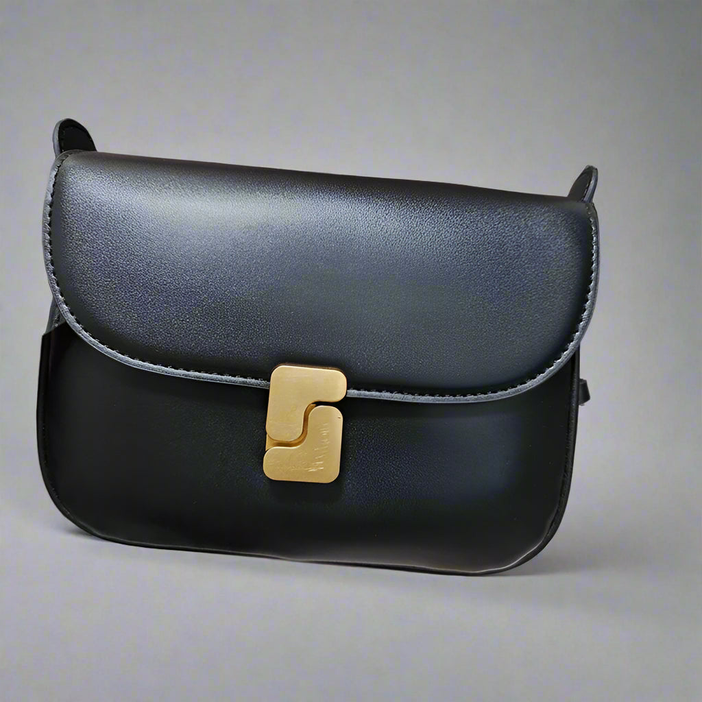 The Regents Park vintage style shoulder bag is an envelope style box style featuring gently rounded edges to the flap. Puzzle style hasp closure in brushed gold. Three interior compartments. Black, Dark Brown, Purple, Sage Green and Tan.